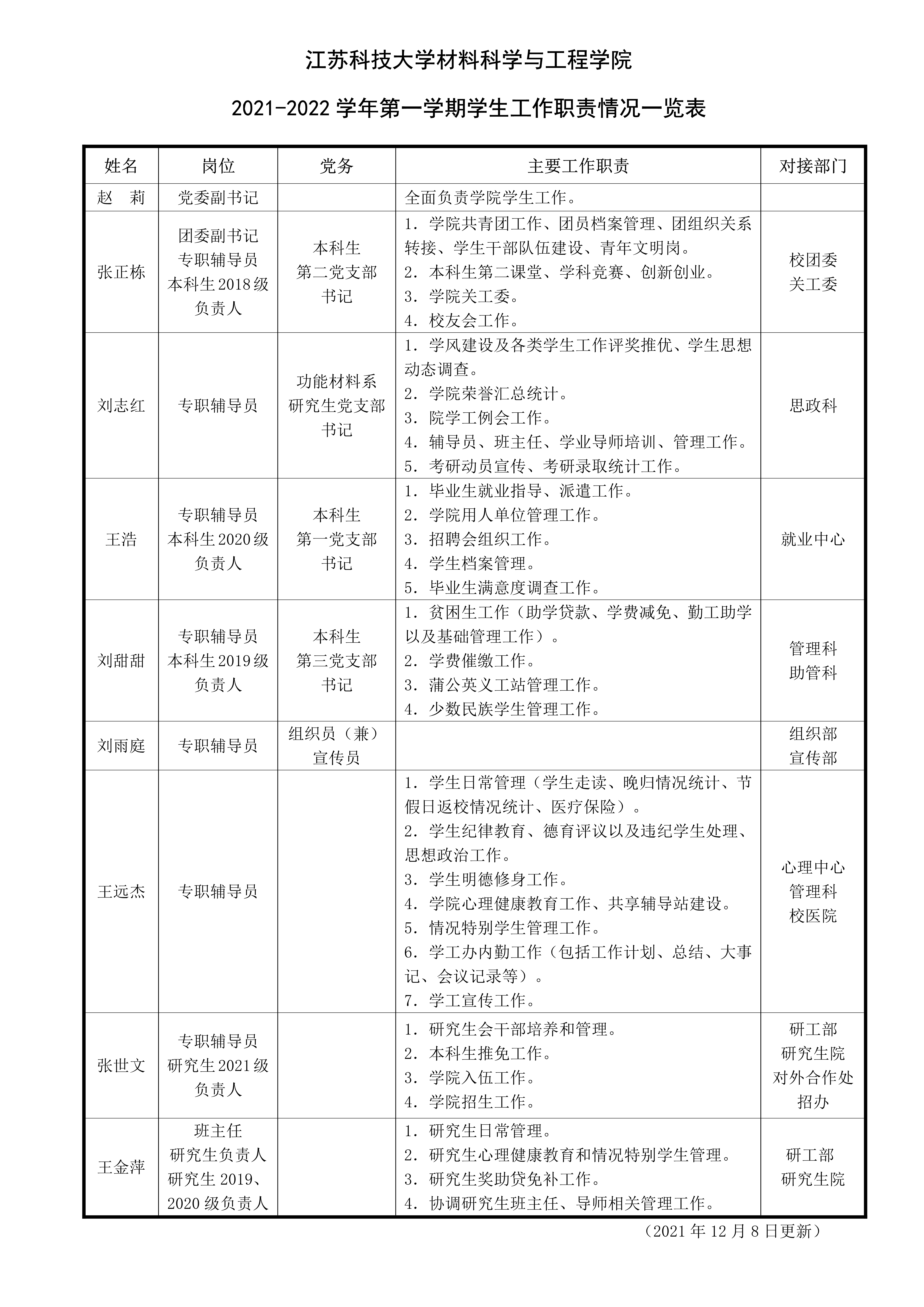 材料學院 2021-2022學年第一學期學生工作職責情況一覽表