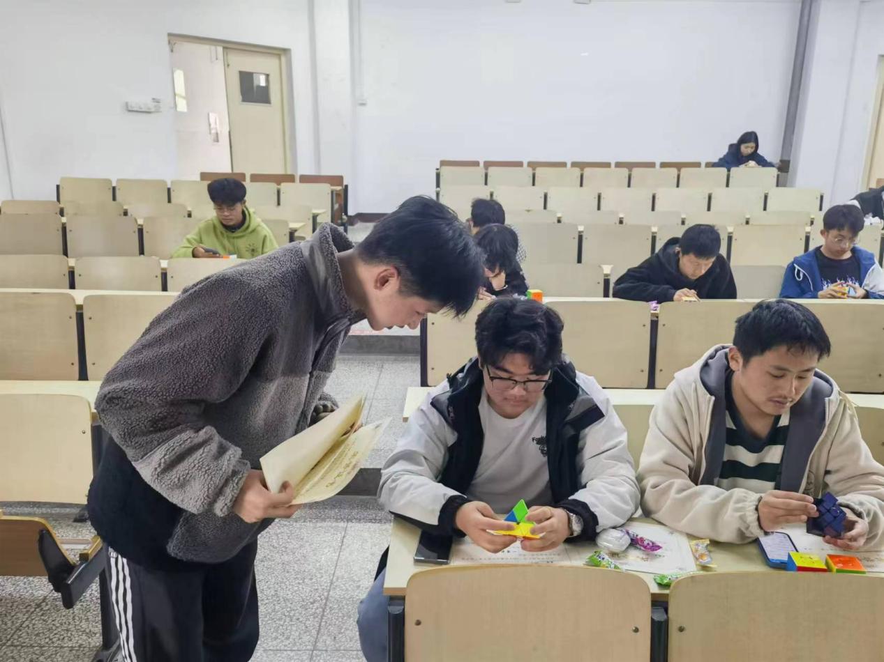活動(dòng)中,學(xué)長(zhǎng)們首先與大一社員交流魔方經(jīng)歷,分享大賽體驗(yàn),并通過互動(dòng)的方式教會(huì)大家更深層次的公式理解及訓(xùn)練方法,幫助社員取得技術(shù)上的突破,也增強(qiáng)社員們的自信以及深入學(xué)習(xí)的動(dòng)力。比賽中,選手在裁判的監(jiān)督下復(fù)原被打亂的魔方,確認(rèn)成績(jī)后將成績(jī)單交由工作人員,過程井然有序、有條不紊。