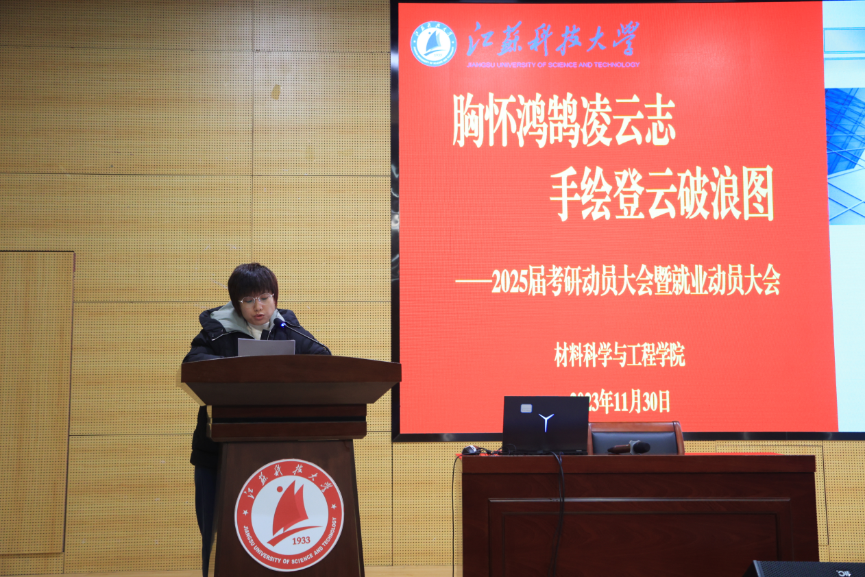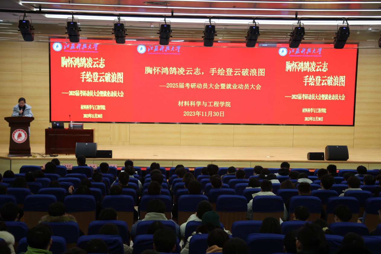 為更好地指導(dǎo)同學(xué)們作好學(xué)業(yè)規(guī)劃,有意識(shí)地開展考研和就業(yè)準(zhǔn)備工作,11月30日下午,材料學(xué)院在長(zhǎng)山校區(qū)圖書館105報(bào)告廳召開2025屆考研就業(yè)動(dòng)員大會(huì),引航學(xué)生成長(zhǎng)。山東大學(xué)陳姬教授、哈爾濱工業(yè)大學(xué)初冠南教授、天津大學(xué)馬哲教授、江蘇科技大學(xué)胥國(guó)祥教授、二重(鎮(zhèn)江)重型裝備有限責(zé)任公司資深人力資源管理經(jīng)理章婕、材料學(xué)院黨委副書記楊海濤,輔導(dǎo)員劉志紅、張正棟、涂亦凡與2021級(jí)全體學(xué)生參加會(huì)議。會(huì)議采用線上線下相結(jié)合的方式進(jìn)行,由楊海濤主持。