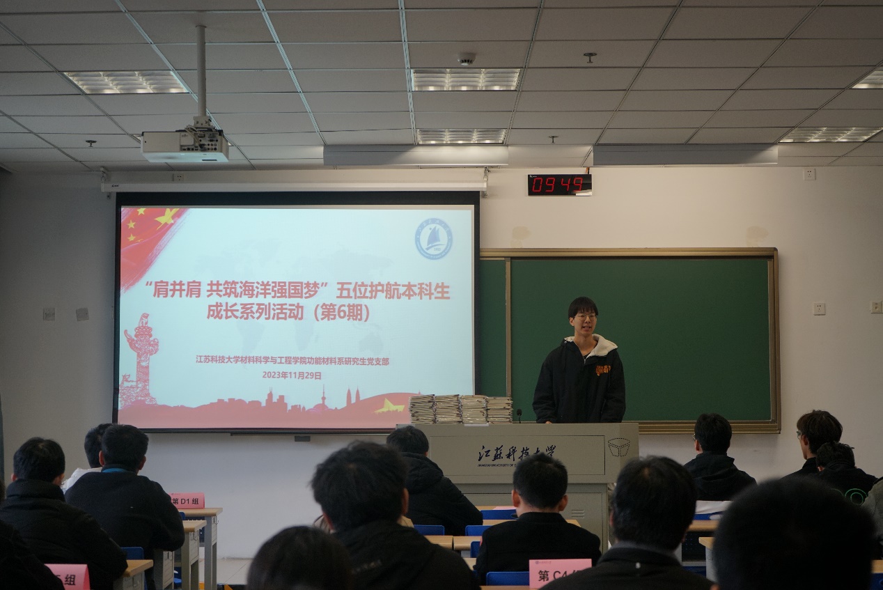 12月1日,材料學(xué)院在文理大樓舉辦了第六期“肩并肩,共筑海洋強(qiáng)國(guó)夢(mèng)”五位護(hù)航本科生成長(zhǎng)活動(dòng)。材料學(xué)院黨委書記李瑞峰、黨委副書記楊海濤、輔導(dǎo)員劉志紅、劉珣,功能材料系研究生黨支部全體黨員、積極分子、受護(hù)航學(xué)生參加活動(dòng)。活動(dòng)由黨支部副書記趙田園主持。