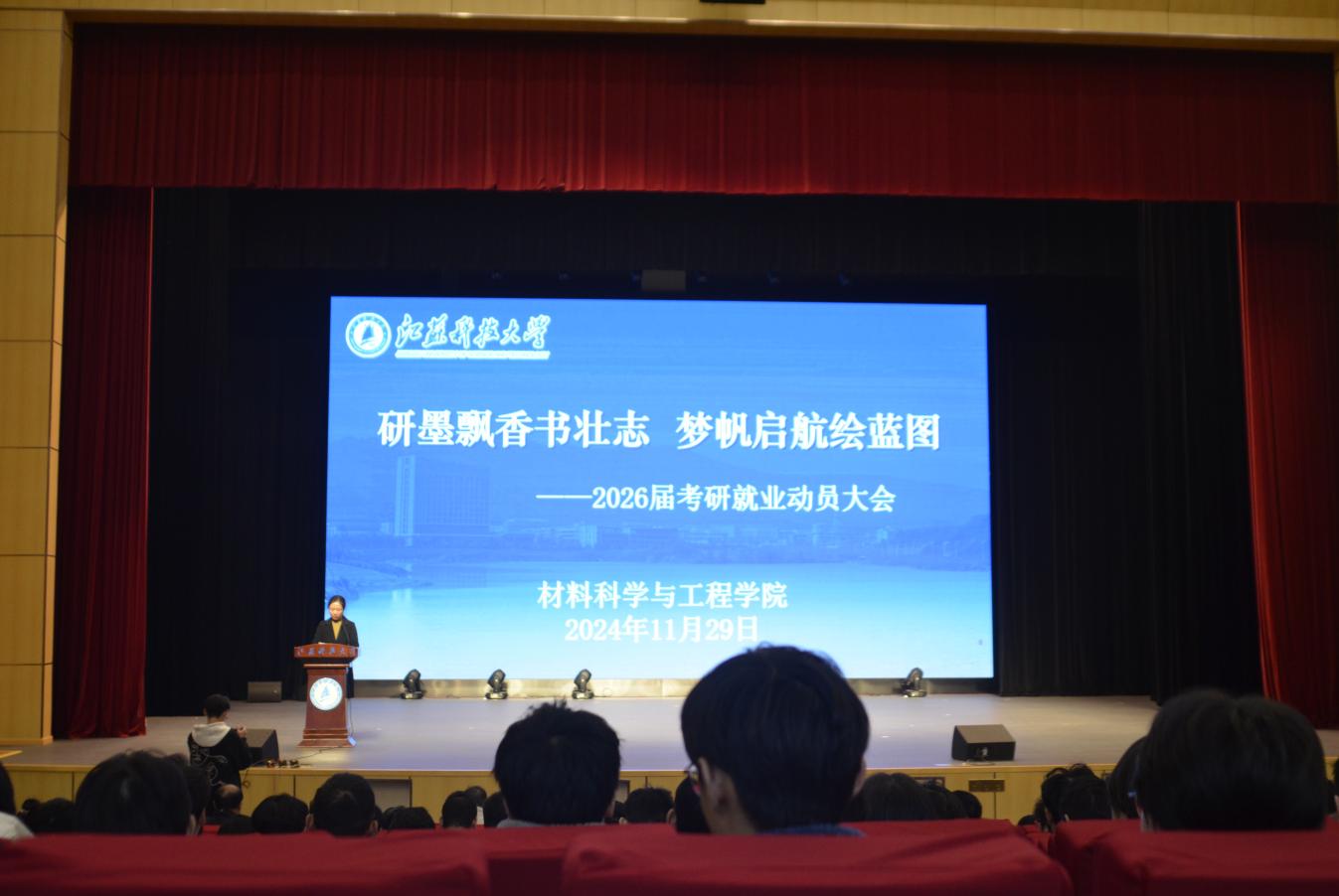 11月29日下午,材料學(xué)院在長(zhǎng)山校區(qū)船苑劇場(chǎng)隆重舉辦了2026屆考研與就業(yè)指導(dǎo)大會(huì),旨在為廣大學(xué)子提供考研規(guī)劃和職業(yè)發(fā)展的專業(yè)指導(dǎo)。本次大會(huì)特邀嘉賓有哈爾濱工業(yè)大學(xué)王廷教授、中山大學(xué)舒鳳遠(yuǎn)教授、蘇州大學(xué)蔡曉旭副研究員、江蘇科技大學(xué)劉彬教授、二重(鎮(zhèn)江)重型裝備有限責(zé)任公司資深人力資源管理經(jīng)理章婕、資深考研規(guī)劃指導(dǎo)老師潘小躍。輔導(dǎo)員劉志紅、劉珣、劉雨庭、曹天龍及2022級(jí)全體學(xué)生參與了此次大會(huì),會(huì)議由學(xué)院黨委副書記楊海濤主持。
